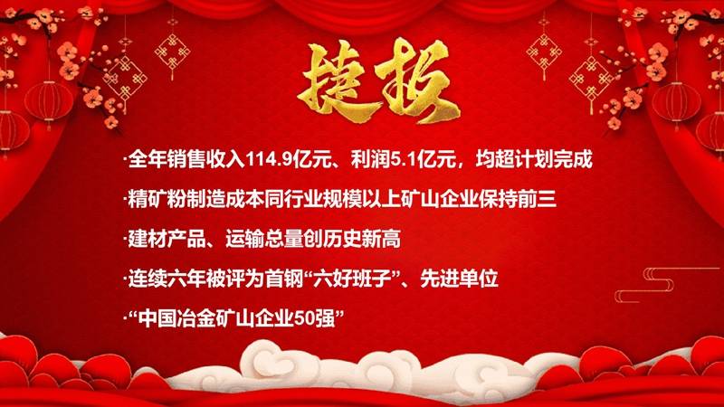全年销售收入114.9亿元、利润5.1亿元,均超计划完成。精矿粉制造成本在同行业规模以上矿山企业保持前三,建材产品和运输总量创历史新高。矿业公司连续六年被评为首钢“六好班子”、先进单位,被授予“中国冶金矿山企业50强”荣誉称号。
