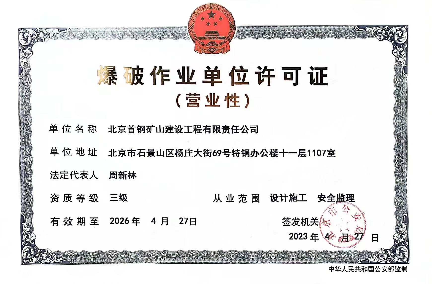 矿业公司矿建公司取得营业性爆破作业许可证三级资质