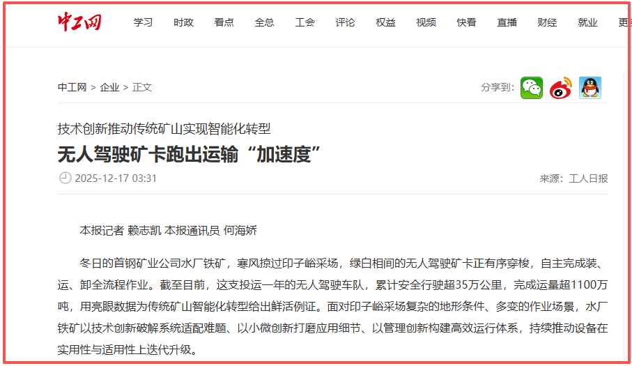 冬日的首钢矿业公司水厂铁矿,寒风掠过印子峪采场,绿白相间的无人驾驶矿卡正有序穿梭,自主完成装、运、卸全流程作业。截至目前,这支投运一年的无人驾驶车队,累计安全行驶超35万公里,完成运量超1100万吨,用亮眼数据为传统矿山智能化转型给出鲜活例证。面对印子峪采场复杂的地形条件、多变的作业场景,水厂铁矿以技术创新破解系统适配难题、以小微创新打磨应用细节、以管理创新构建高效运行体系,持续推动设备在实用性与适用性上迭代升级。