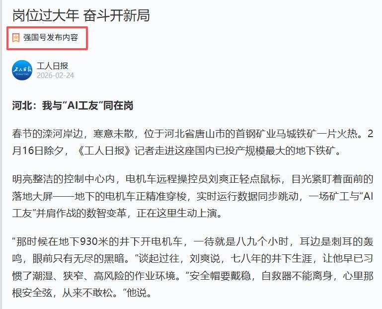 如今,依托覆盖全矿的5G专网和AI智能平台,矿上7类74台套关键设备已实现地表远程操控,操作精度超90%。井下作业人员大幅缩减,劳动强度显著降低。从AI轨道检测、智能光纤振动预警,到通风按需调节、能耗动态优化,一系列“AI工友”陆续上岗,与职工构建起“人机协同”新生态。