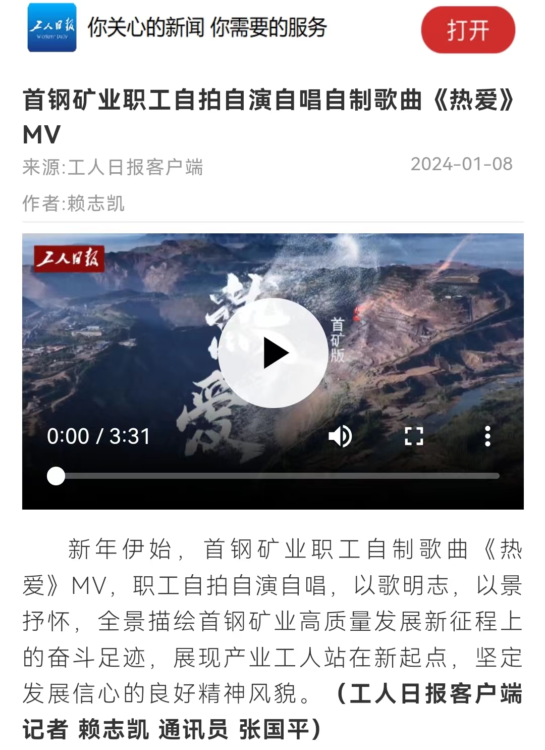 《工人日报》:首钢矿业职工自拍自演自唱自制歌曲《热爱》MV